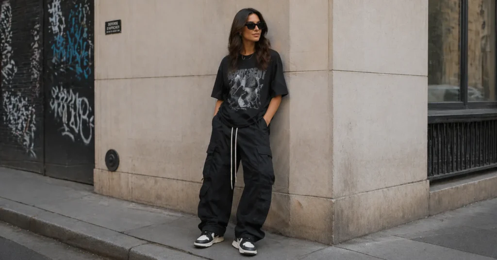 • Essential Pieces: Baggy cargo pants, oversized hoodies, graphic t-shirts, and exclusive collectible sneakers.